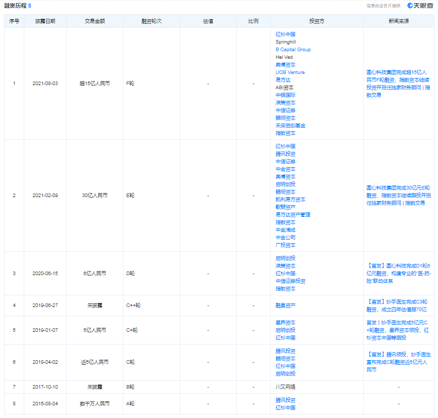 此外,圓心科技還是騰訊、紅杉資本、啓明資本、中信證券、ABI資本、中銀國際、渶策資本、鯤翎資本等知名投資機構重倉加持的另一大互聯網醫療科技獨角獸企業。