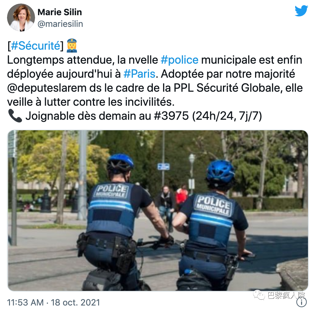另外,市政警察將會每週7天、每天24小時為居民服務,從10月19日也就是明天開始,巴黎居民日常生活中有啥問題,可以撥打3975(每週7天,每天24小時)和市政警察進行聯繫。