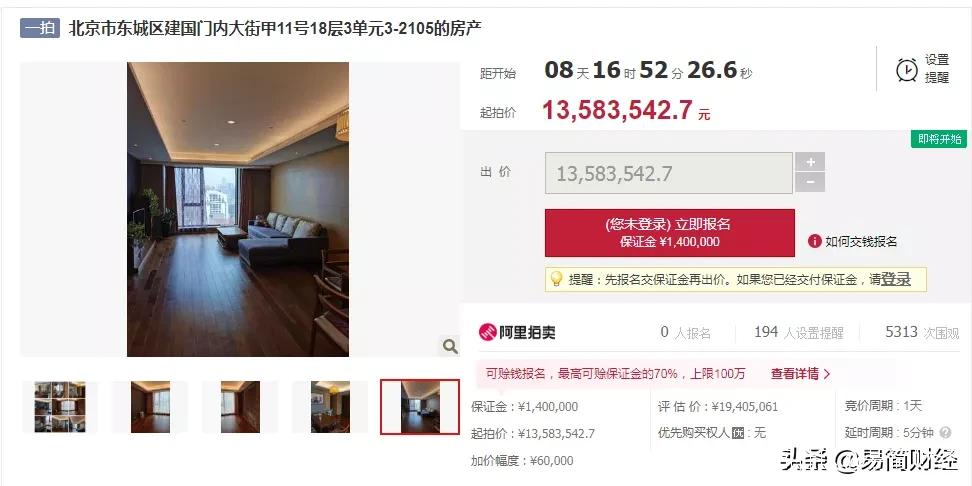 房屋建築面積是173.25平米,2012年建成,評估價為1940萬餘元,起拍價1358萬餘元,加價幅度6萬,競拍者需要繳納140萬元保證金。