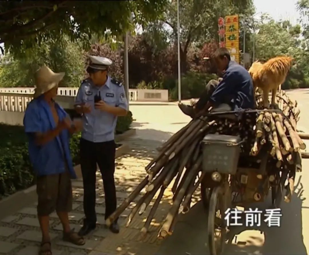 一個老頭推着板車,拉着一個同樣邋遢的男人。