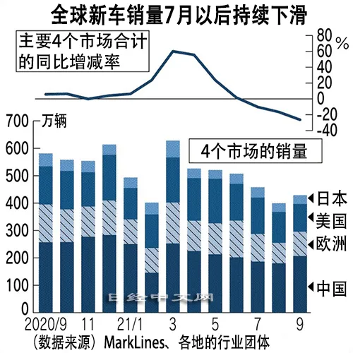 **中日美歐等四個主要市場的9月銷量比上年同月減少26%。降幅連續3個月擴大。**恢復正常被認為要等到明年初,還有估算認為世界汽車大型企業的營業收入減少將達到合計24萬億日元。