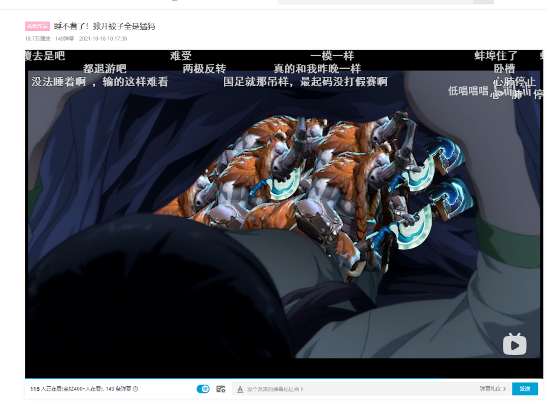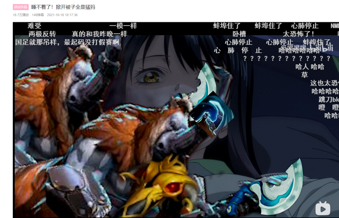 有人剪了個視頻,動畫裏的女主看完了比賽在牀上輾轉反側睡不着,結果一掀開被子,被子裏全都是猛獁,而彈幕都在刷“真的和我昨晚一摸一樣”