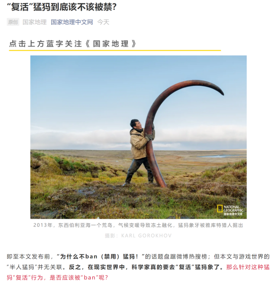 剛發完怒吼沒多久,國家地理的微信公眾號就推了一篇文章,説很多人正在試圖復活猛獁象: