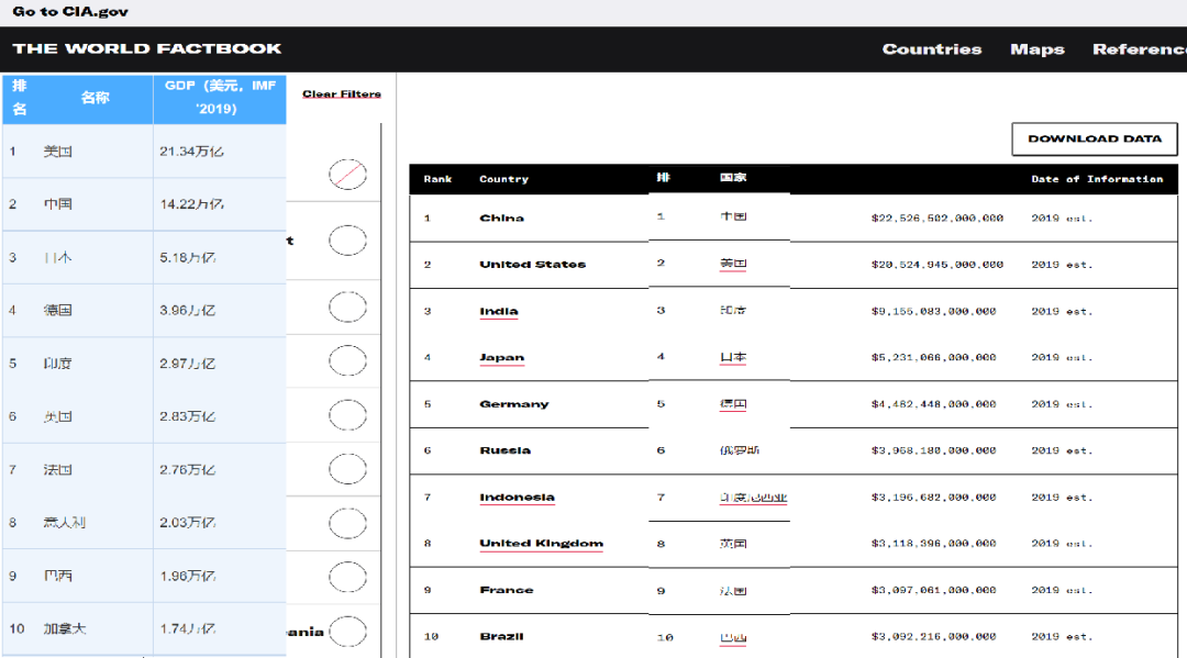 按匯率計算,國際貨幣基金組織IMF給出的世界各國2019年GDP排名是:美國、中國、日本、德國、印度、英國、法國、意大利、巴西、加拿大。中情局官網掛在網上的數據則是如下圖: