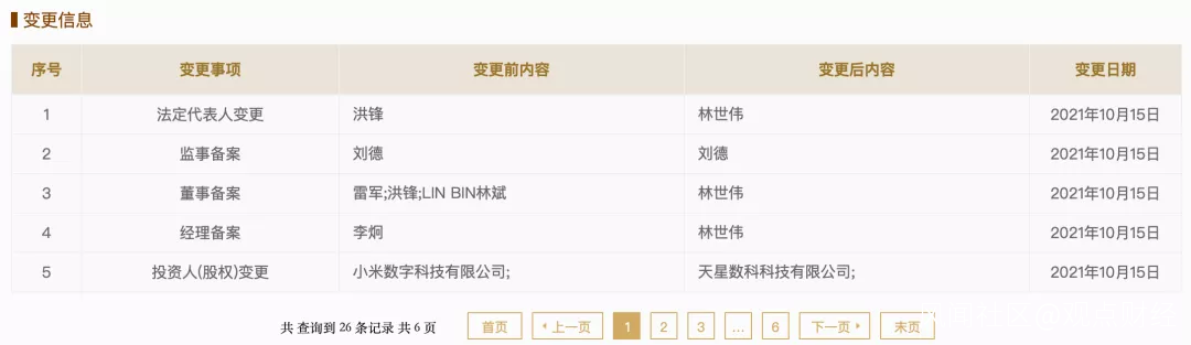 “上海小米金融”)董事會名單,法人由洪鋒變更為林世偉。小米金融APP原本隸屬於上海小米金融。同日,小米集團公佈人事任命調整,小米集團CFO林世偉兼任天星數科CEO,相關工作向天星數科董事長洪鋒彙報;任命天星數科副總裁趙衞星兼任天星數科首席產品官。據公開信息,小米聯合創始人洪鋒此前兼任天星數科董事長及CEO。