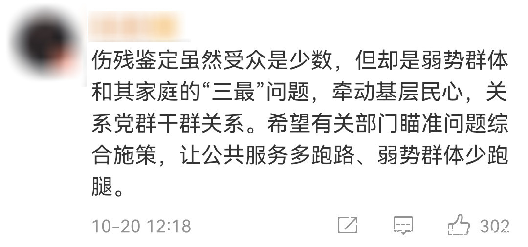 有網友給出建議,殘疾人畢竟是少數,失去行動能力者更是少之又少,是不是可以提供上門鑑定。