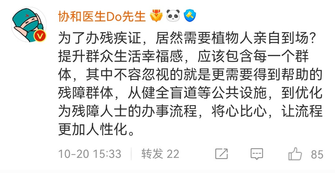武漢協和醫院的醫生@協和醫生Do先生 也表示,“提升羣眾生活幸福感,應該包含每一個羣體,其中不容忽視的就是更需要得到幫助的殘障羣體,從健全盲道等公共設施,到優化為殘障人士的辦事流程,將心比心,讓流程更加人性化。”