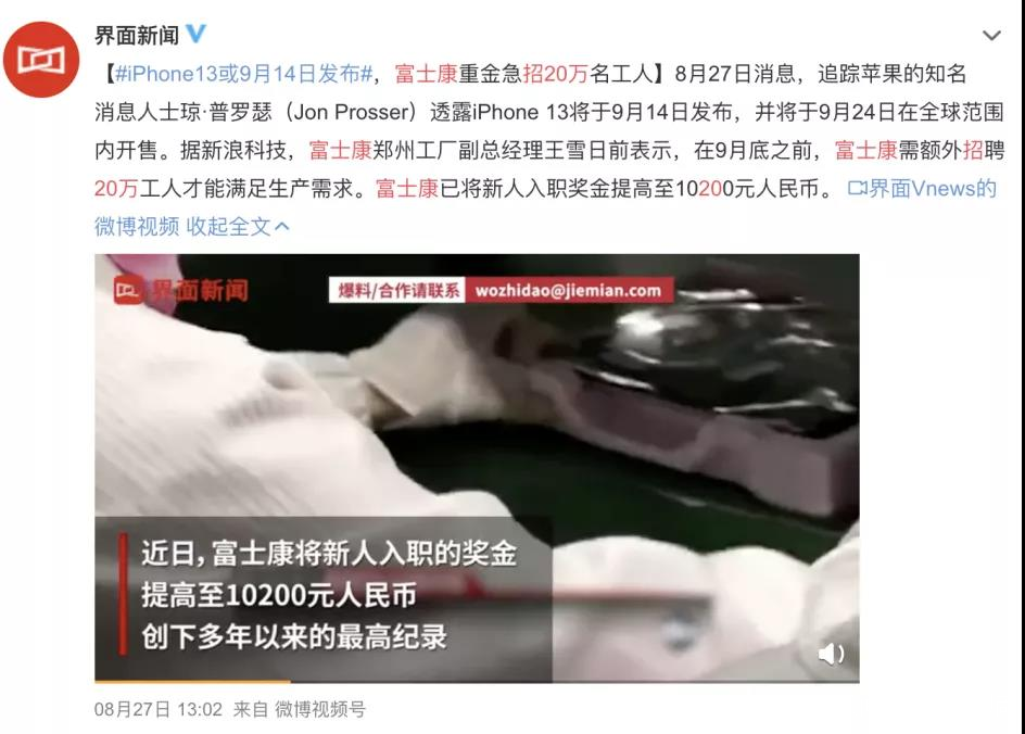 現在,富士康這樣的流水線工廠卻遭遇了“用工荒”。9月底前,富士康急招20萬名工人,並許下高額獎金。只要在職90天,在崗55天,遵紀守規,每個新人都能拿到10200元人民幣。在鄭州港區富士康,這個數字在幾天前曾達到13000元。