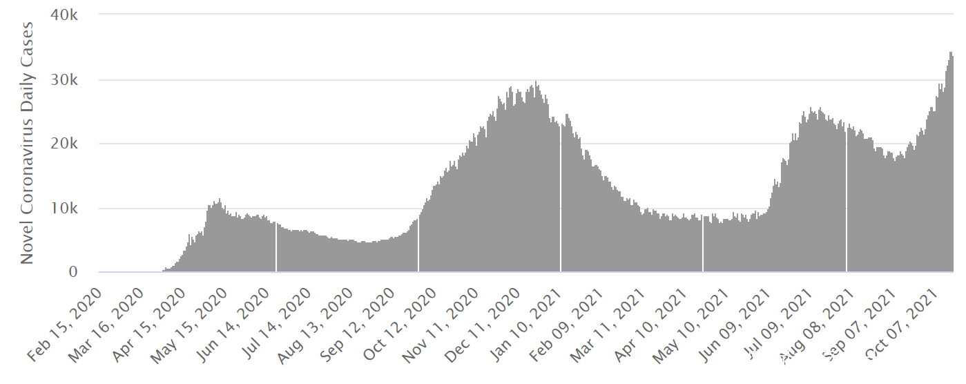 俄羅斯單日新增確診病例(2020.02.15-2021.10.19**)**
