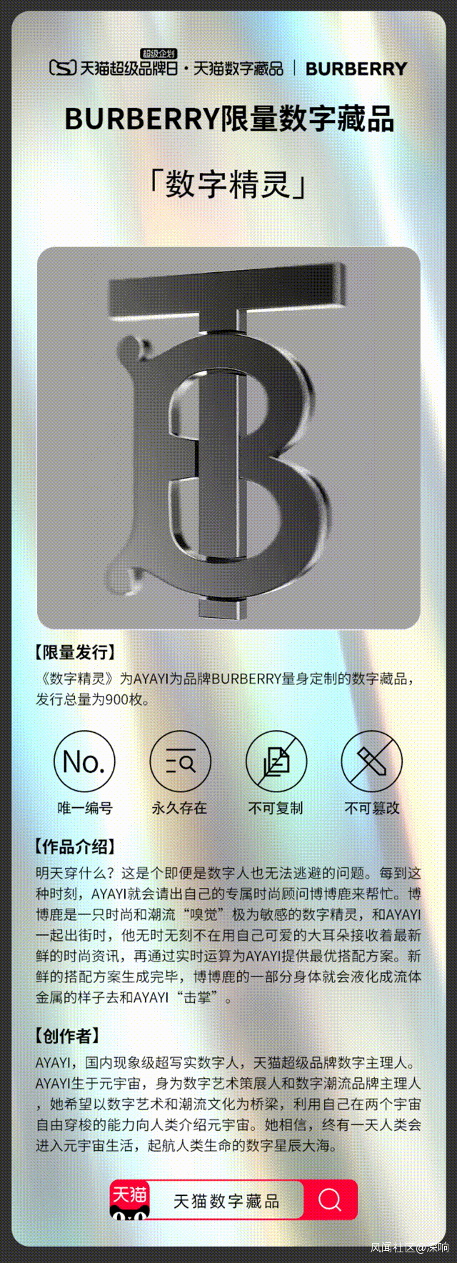 例如針對奢侈品牌Burberry,AYAYI製作了一款名叫“數字精靈”的藏品,該款藏品以一個名叫“博博鹿”的小鹿形象為核心,賦予了它對時尚和潮流"嗅覺"極為敏感的特點,意在為人們提供穿搭選擇。在動態效果上,代表着品牌名稱的BBR字樣通過旋轉帶出小鹿形象,並呈現出液態金屬的高級感。