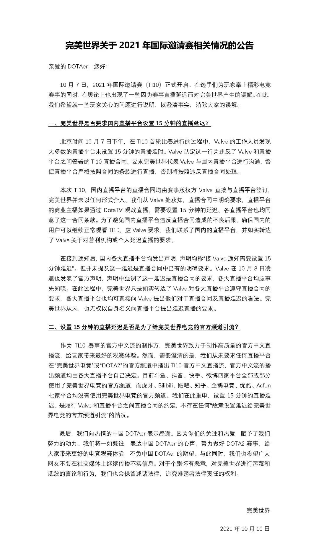 10月7日,鬥魚、虎牙等直播平台的官方微博發佈公告稱,接到開發商Valve的官方通知,主播在轉播Ti10的比賽內容時,需要與DOTA2的客户端內容保持15分鐘的延遲。