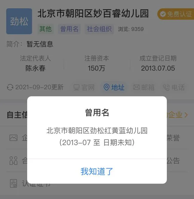 資料顯示,北京市朝陽區妙百睿幼兒園成立於2013年7月,註冊資本150萬人民幣,法定代表人為陳永春。該幼兒園曾用名為“北京市朝陽區勁松紅黃藍幼兒園”。