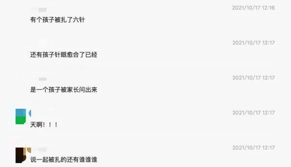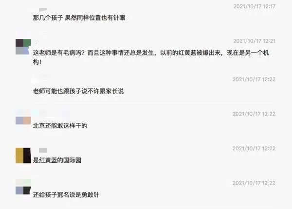 家長們稱,該幼兒園學費一個月1.2萬,屬於國際園“紅黃藍高端的”,“還給孩子冠名説是勇敢針”。根據網曝信息,有家長稱班裏五個孩子被老師拿針紮了,照片與醫院鑑定結果也都出了;有的孩子被紮了六針,還有的孩子針眼都已痊癒。