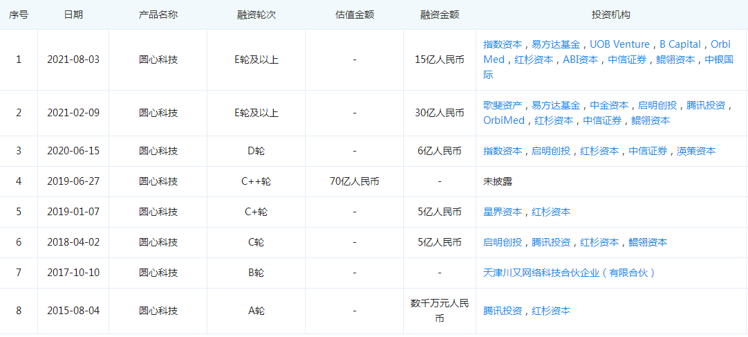 正是基於圓心科技自身不錯的發展潛力和互聯網醫療市場的火熱,圓心科技已斬獲8輪融資,並獲得了騰訊、紅杉等明星資本站台,融資金額超61億元。