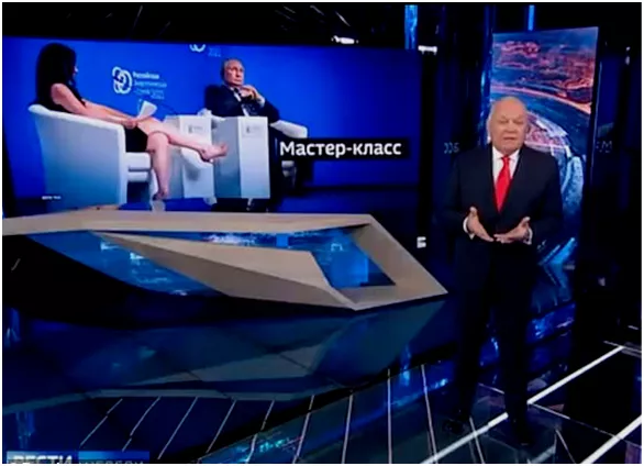 索洛維約夫首先稱,甘布勒在當天的節目裏舉止風騷,試圖分散普京的注意力。