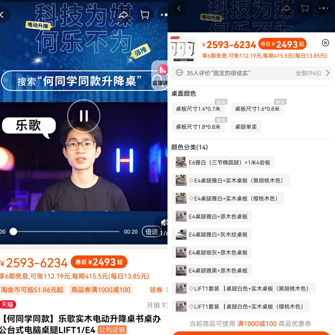 目前,在樂歌的天貓旗艦店中,“何同學同款”的三種升降桌有從529元到6086元不等的幾種款式,價格並不低,但仍有不少種類的商品顯示已經呈缺貨狀態。