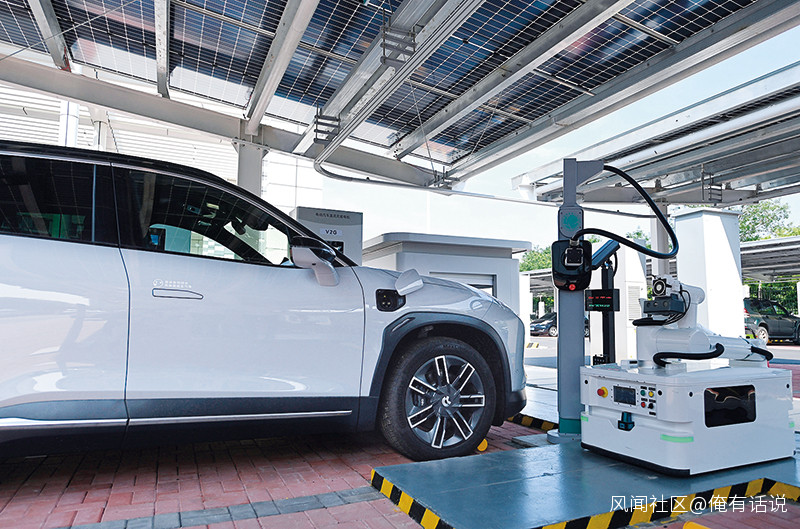 8月18日,天津津門湖新能源汽車綜合服務中心,機器人正在為新能源汽車充電 李然攝/本刊