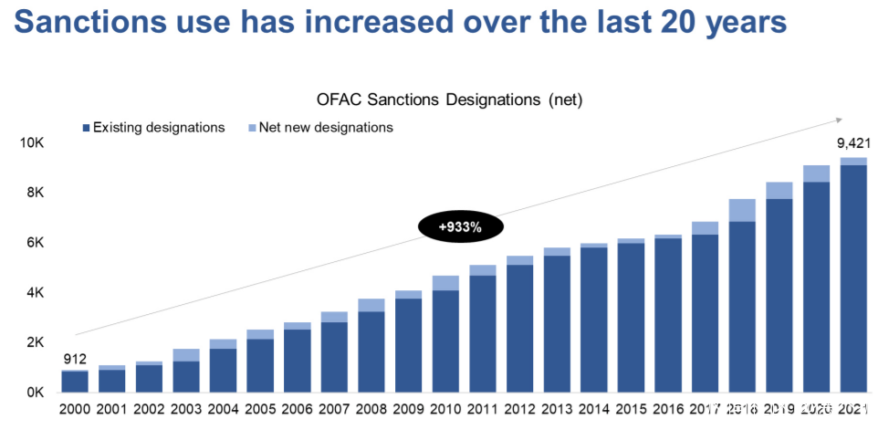 從報告披露的數據來看,美國OFAC制裁數量從2000年的912個增至2021年的9421個,增幅高達933%。尤其是新增數量直線上升,而撤出數量基本穩定。