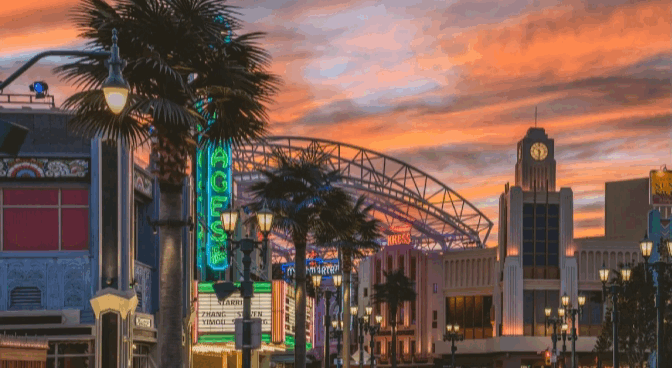 場內共分為七個區域,包含最入口處的好萊塢園區,和按順時針的侏羅紀世界努布拉島、變形金剛基地、功夫熊貓蓋世之地、未來水世界、哈利波特的魔法世界,以及小黃人樂園。