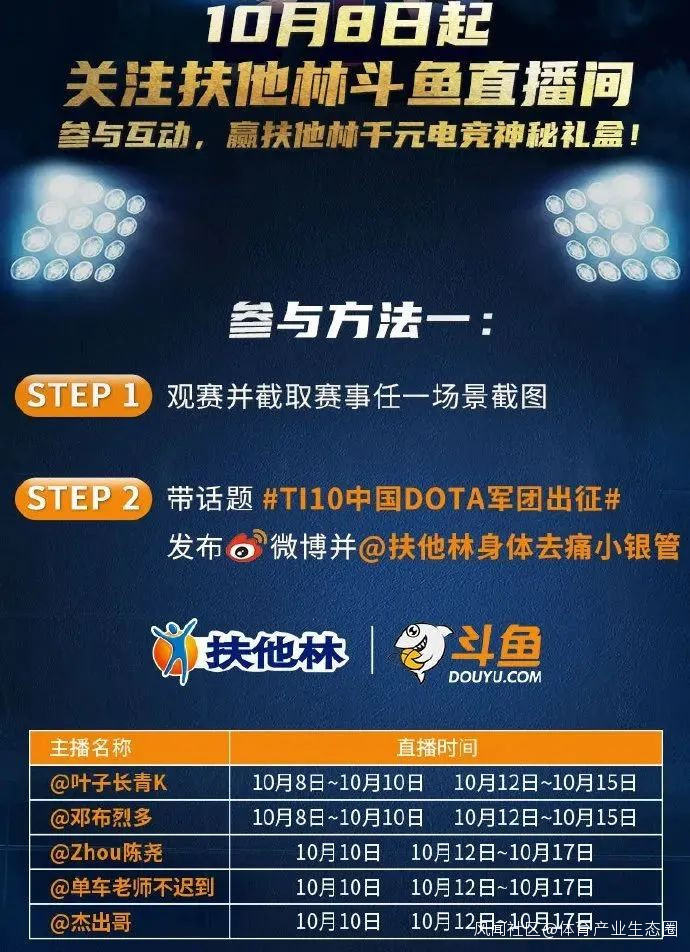 這種特殊的觀看生態也開啓出商業上的新形態,特別是TI賽事又不設置官方合作伙伴的情況下,主播們的直播間就自然而然成為了品牌眼裏不能錯過的重要營銷陣地。扶他林在賽前與PSG.LGD、IG、VG三支戰隊達成合作,TI10中國軍團五支出征戰隊獨中三元,實屬亮眼。同時又與包括陳堯Zhou、傑出哥等在內的五位鬥魚主播聯手,在直播過程中穿插口播或畫面直接出現品牌LOGO等形式,時刻向觀眾輸出贊助商的品牌曝光。