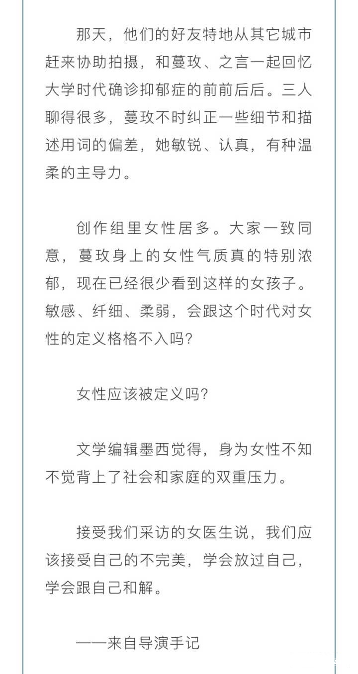 **拍攝時切入的角度,探討的話題,其實遠比目前呈現的要深刻、全面、豐富。可以説根本不是同一層面的。**幾乎每一個被大家激烈討論甚至可能引起爭議的話題都有所涉及。刻板印象、病恥感、醫患矛盾、信息誤差、學術爭議、情感模式、文化背景……這樣的內容極多。至於我的部分,我們也探討了大量的女性問題與文學、藝術、哲學甚至宗教中的抑鬱意象。有一些是我們雙方都覺得非常難能可貴的東西。但這些都沒有在正片裏呈現。