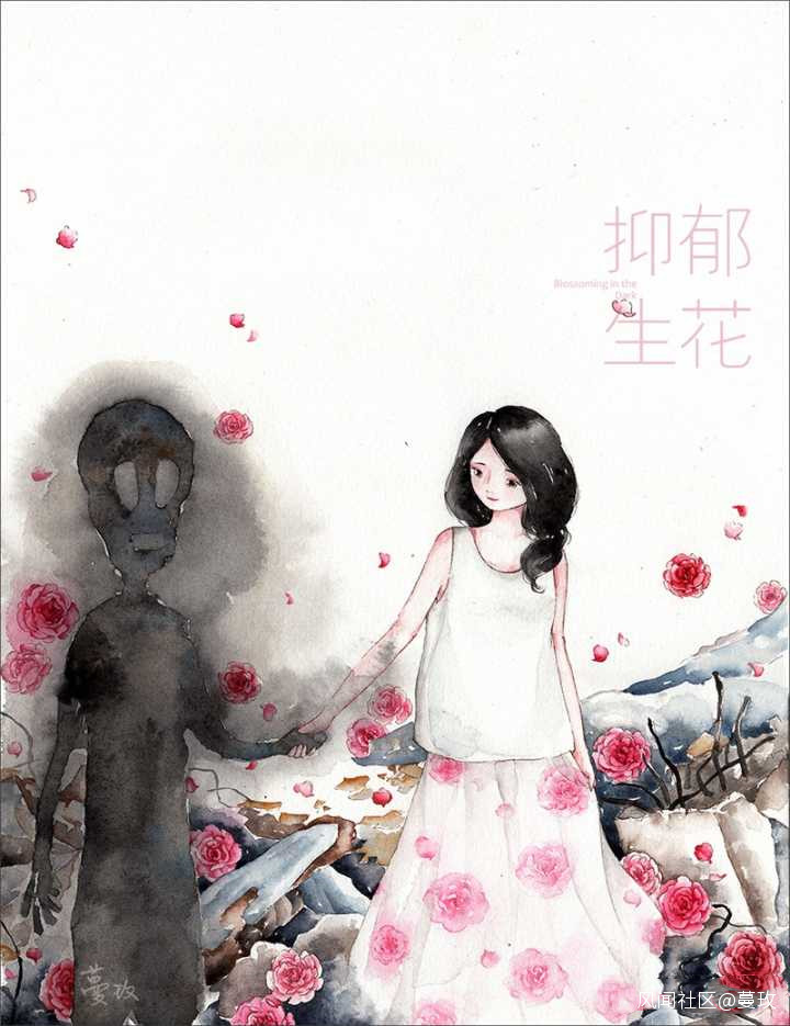 《抑鬱生花》裏的手繪,這是我自己最喜歡的一張,《共生》。「我不想再害怕你、抗拒你、逃避你、消滅你。我希望能與你和解。今後的日子,我願意與你同行。」——拍攝時我們也有探討到這個話題,但很可惜最後沒有用上。