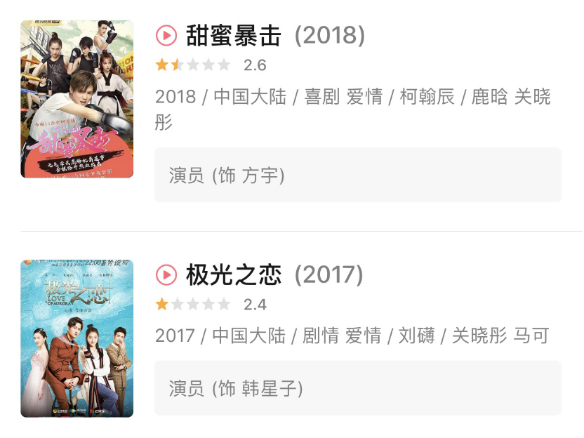 可能也是這種自信,讓她確定自己就是瑪麗蘇本蘇。當時也恰逢她成年不久,所以她開始接演一些戀愛劇,也許是為了流量,挑的劇本都是偏向偶像類型的,其中《甜蜜暴擊》、《極光之戀》兩部劇均遭遇羣嘲,至今都是網友口中爛劇的代表作。