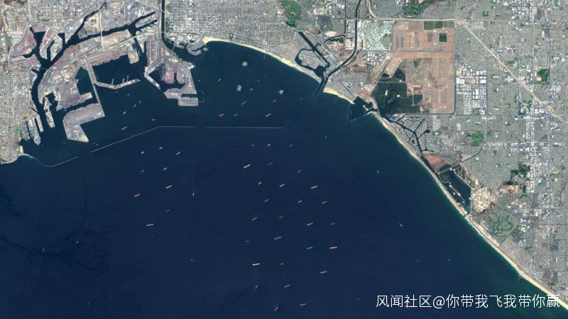 滿載貨物的船隻正在洛杉磯和長灘港口外等候(圖為顯示集裝箱船在洛杉磯港外等候的衞星圖像)。