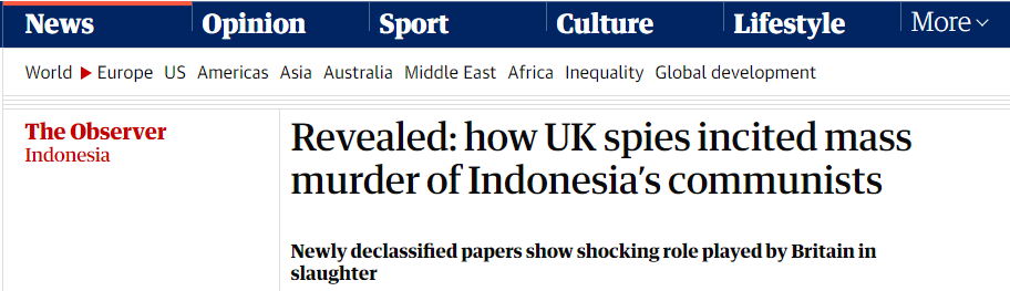 解密文件顯示,英國20世紀60年代一直在秘密策劃宣傳攻勢,煽動印尼軍方和反共人士“切掉共產主義癌症”,剷除印尼共產黨,最終釀成了這場“20世紀戰後最為殘酷的血腥屠殺”。