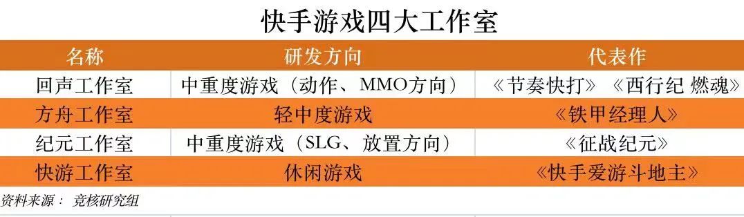 像方舟工作室主攻輕中度遊戲,代表作如《鐵甲經理人》;紀元工作室則主攻中重度遊戲(SLG),代表作如《征戰紀元》;快遊工作室重點在休閒遊戲上,代表作如《快手愛遊鬥地主》;回聲工作室主攻中重度遊戲(MMO方向),代表作如《節奏快打》《西行紀 燃魂》。