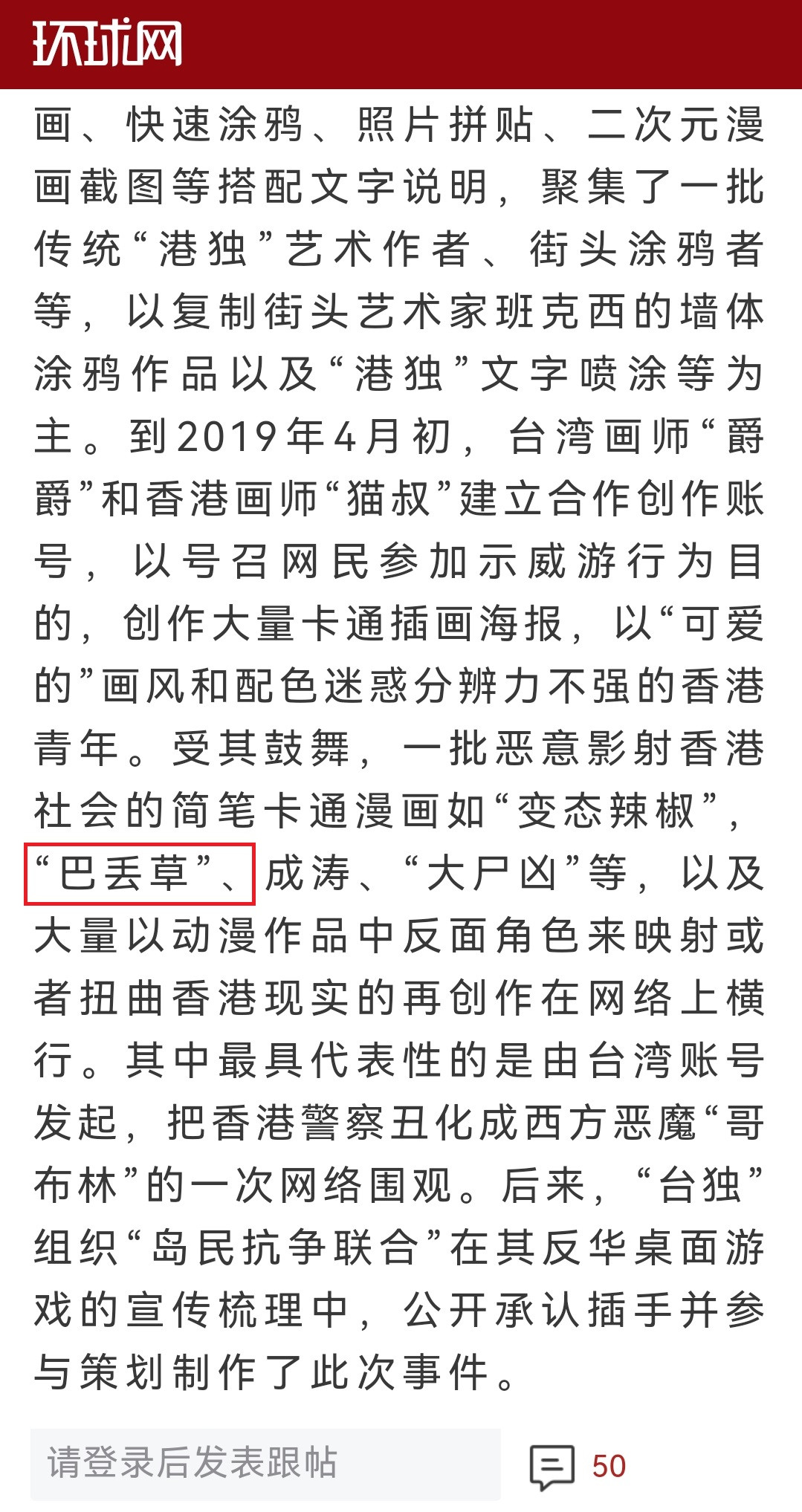 2019年4月初,台灣畫師“爵爵”和香港畫師“貓叔”建立合作創作賬號,以號召網民參加示威遊行為目的,創作大量卡通插畫海報,以“可愛的”畫風和配色迷惑分辨力不強的香港青年。受其鼓舞,一批惡意影射香港社會的簡筆卡通漫畫如“變態辣椒”,“巴丟草”、成濤、“大屍兇”等,以及大量以動漫作品中反面角色來映射或者扭曲香港現實的再創作在網絡上橫行。