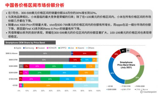 市場研究機構Counterpoint數據顯示,2021年7月份中國智能手機市場份額中,小米佔據了15%,榮耀僅僅落後小米2%,市場份額迅速恢復到了13%。