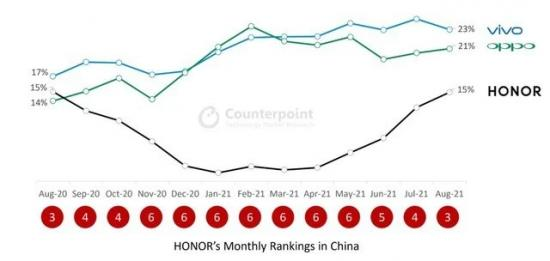 市場研究機構Counterpoint最新報告也顯示,2021年8月,中國智能手機市場份額中榮耀佔比15%,超過小米,成為中國第三大智能手機品牌。在國內市場銷售額增長18% ,成為中國增長最快的品牌之一。