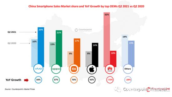 而回到國內市場,根據最新的2021年第二季度數據,中國的智能手機銷量環比下降13%,同比下降6%。在出貨量整體下降的大背景下,2021年第二季度,國內市場排名前三的手機廠商為:vivo(23%)、OPPO(21%)和小米(17%)。