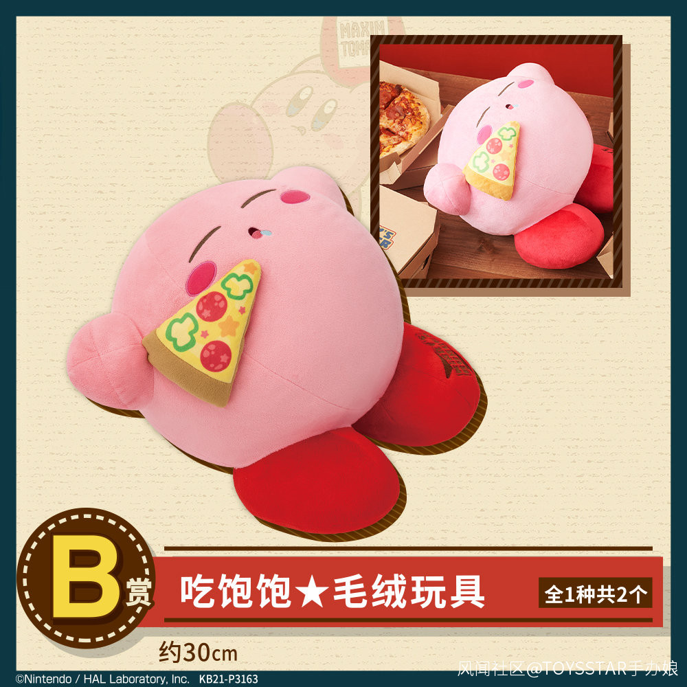 B賞是吃飽喝足睡大覺的卡比毛絨玩偶,睡覺時流着口水、一手還拿着比薩餅的卡比看上去相當軟萌,快來與卡比一起睡覺吧!