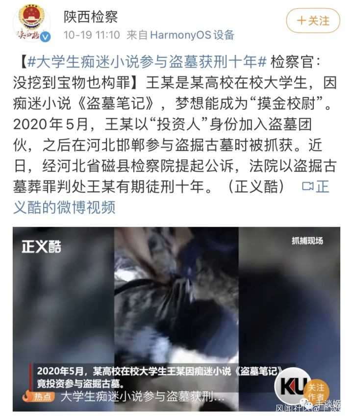 10月19日,陝西檢察發佈了一條新聞,説有個叫王某的在校大學生,因為痴迷小説《盜墓筆記》,結果真當了盜墓賊……然後成功被抓了。