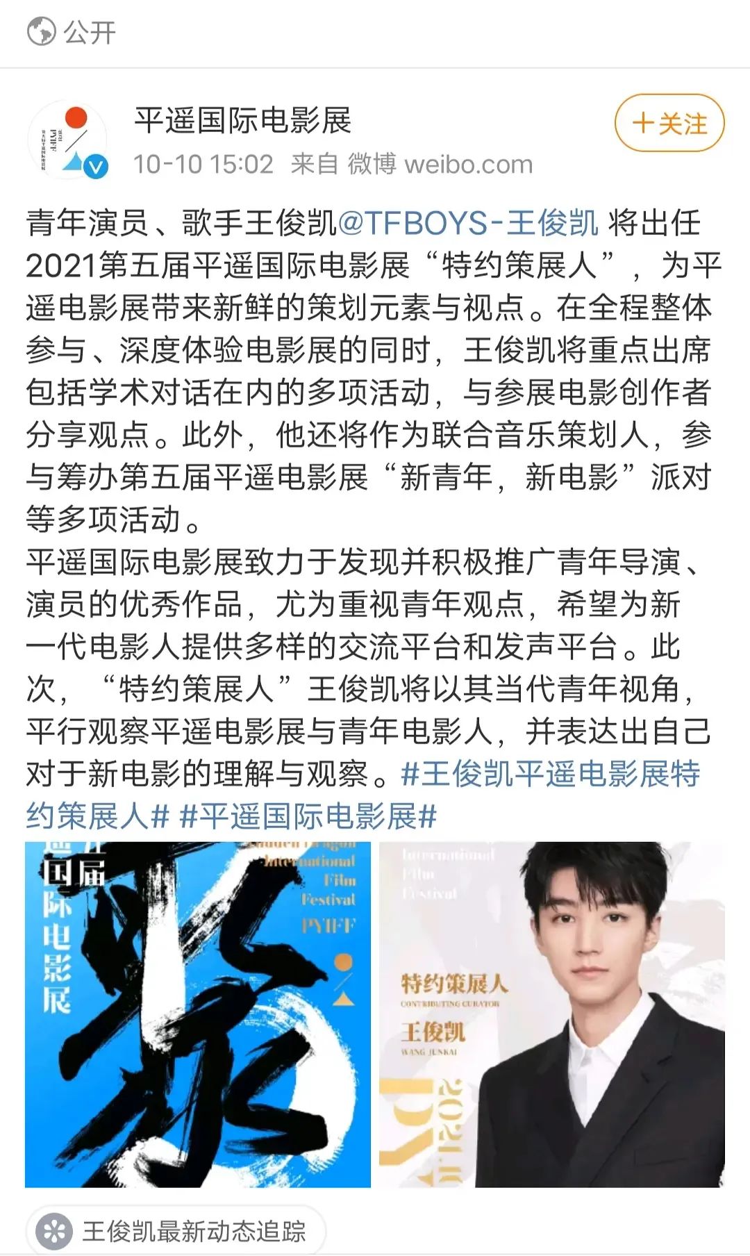事實上,王俊凱身上自帶的流量的確發揮了作用。官宣當天,#王俊凱平遙電影展特約策展人#便登上了熱搜,而這是其他參與平遙的電影人身上沒有發生的事。在社交平台搜索“平遙”二字,跳出來的多是與王俊凱有關的消息。