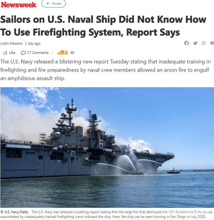 《新聞週刊》:美國海軍週二發佈了一份令人震驚的新報告,稱海軍船員在消防和火災準備方面的培訓不足,導致縱火吞噬了一艘兩棲攻擊艦。