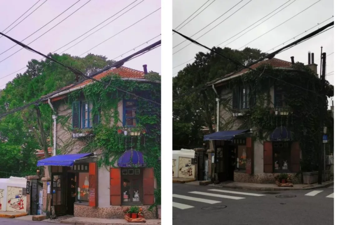 應該能看出來,左邊和右邊不是一個時間和天氣拍出來的,咖啡店小樓的形狀和顏色其實都差不多。
