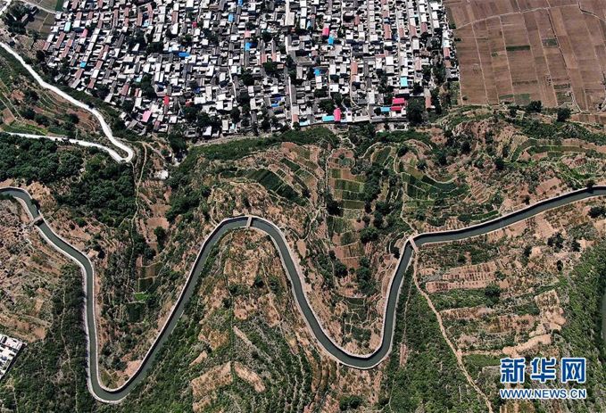 圖為紅旗渠總乾渠從村莊旁繞過 新華網/李安,無人機攝於2019年7月4日