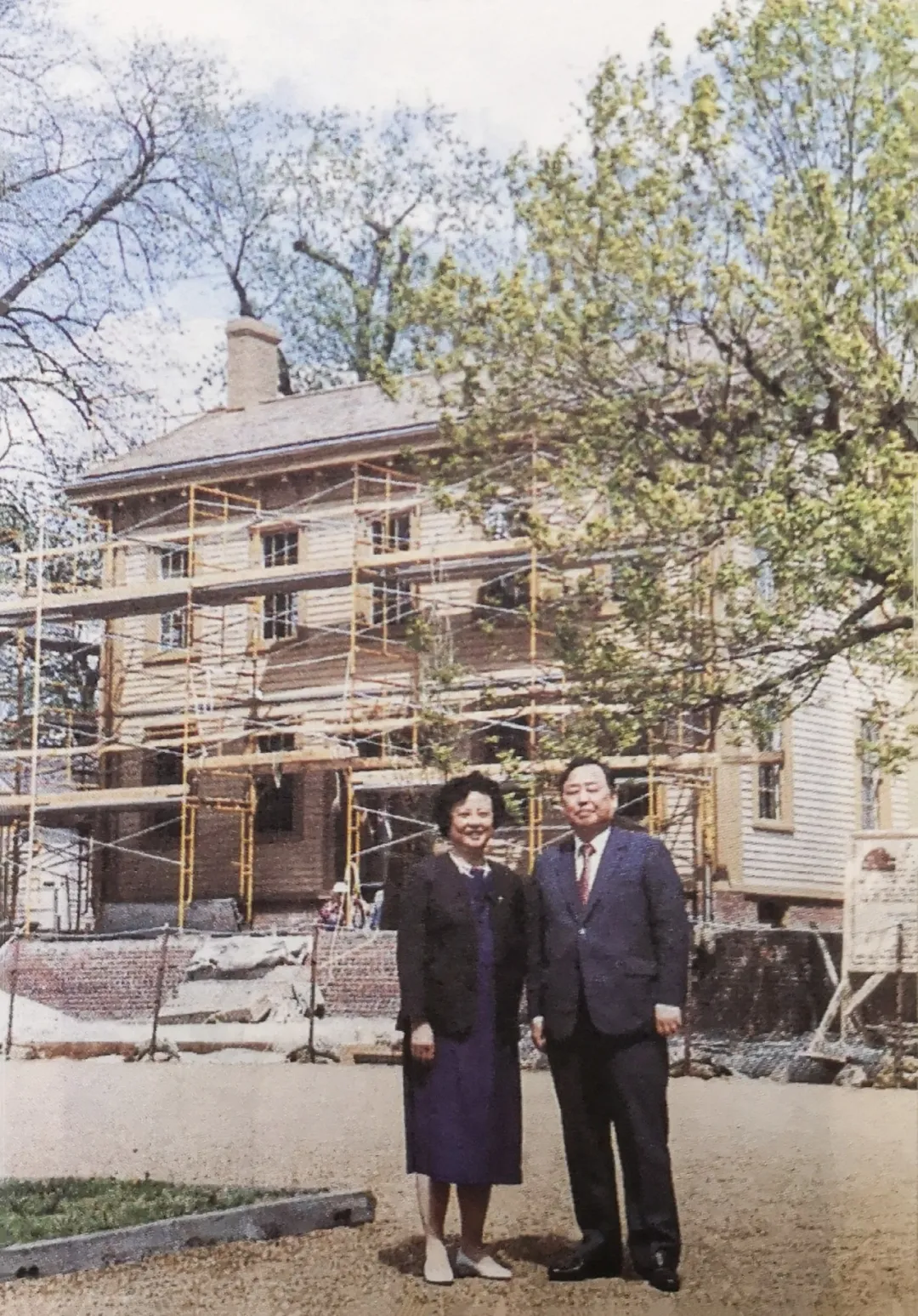 ▷ 作者夫婦在伊州春田市林肯的故居前。故居是一幢兩層樓,當時正在維修,暫停開放。林肯在擔任總統前,曾長期在此地任律師。