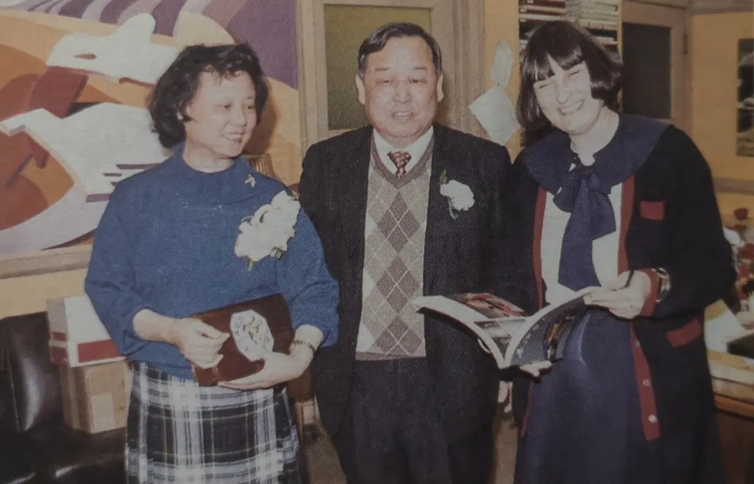 ▷ 美籍華人陳小姐是我們的朋友,她在芝市的一所公立學校任法語教師。經她安排,作者夫婦曾去這所中學參觀。作者夫婦和女校長(右一)在一起並送她一本《中國畫冊》。