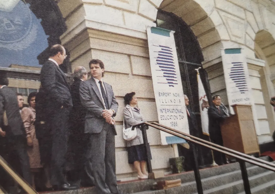 ▷ 1988年春,伊利諾伊州舉行國際教育日活動,目的是為了增加伊州商品出口,鼓勵中小學生學習外語。作者應邀到場為幾百名中小學生演講,最後作者用11種外語説“謝謝”。圖中在講台上演講者為作者,作者身後者為副州長雷恩。