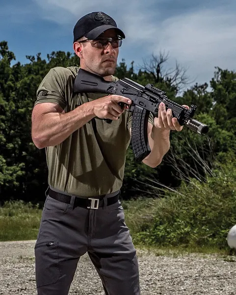 使用AK步槍射擊時,射手首先要將重心略微前移,上半身軀幹向前傾,同時保證自己的胸口正對威脅方向,頭部保持直立並睜大雙眼;同時,慣用手牢牢握住步槍握把,肩膀保持緊張以避免隨意晃動,另一隻手則需要自然托起前握把或護木,確保槍口保持在一個胸腹部的高度——如果太靠上會導致射擊難以控制且反應速度降低,如果太靠下則可能會導致走火誤傷射手本身。