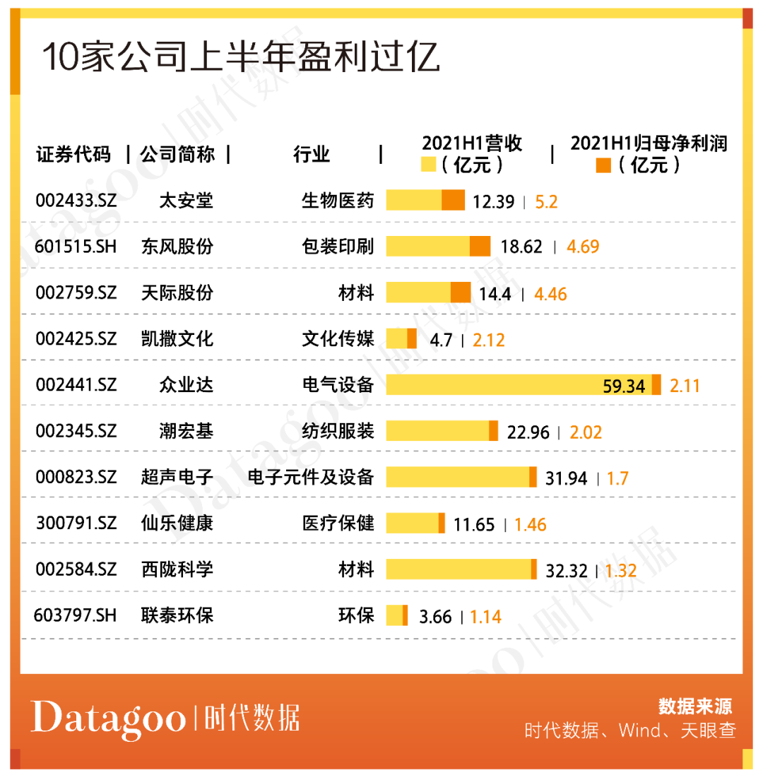 其中,上半年靠非經常性損益避免虧損的太安堂(002433)業績位列第一,上半年營收12.39億元、歸母淨利潤5.2億元。其後,國內領先的包裝印刷服務供應商東風股份(601515)上半年營收18.62億元、歸母淨利潤4.69億元,位列第二;國內領先的鋰離子電池重要原材料提供商天際股份(002759)上半年營收14.4億元、歸母淨利潤4.46億元,位列第三。