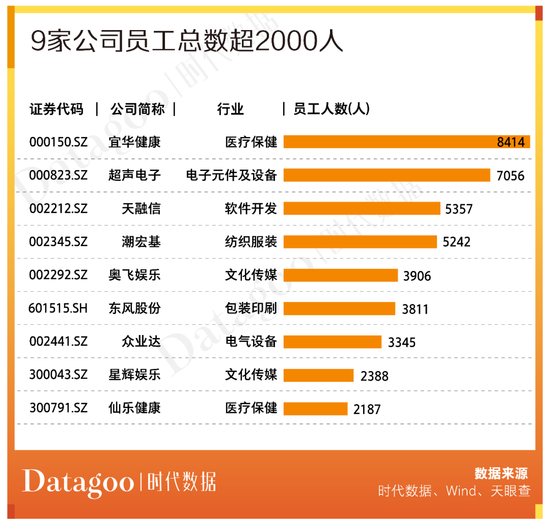 其中,醫療保健企業宜華健康(000150)創造的就業崗位排在第一,擁有員工8414人;其後,國產移動通訊手機印製板的領先配套企業超聲電子(000823)擁有員工7056人,排在第二;國內領先的網絡安全、大數據與雲服務提供商天融信(002212)擁有員工5357人,排在第三。