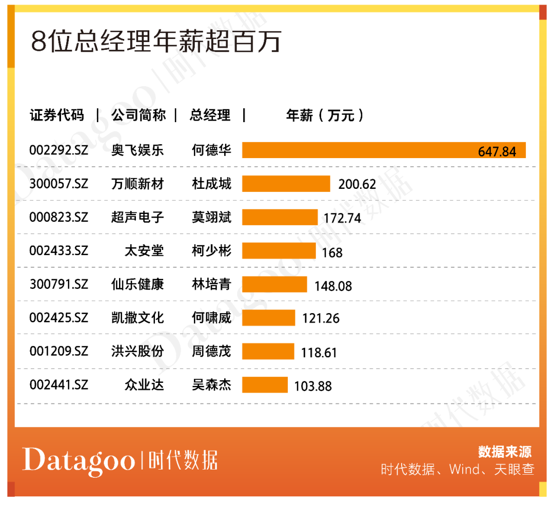 據時代數據統計,在這32家公司中,有8家公司的總經理2020年年薪超過100萬元。其中,排在第一的是奧飛娛樂(002292)總裁何德華,年薪達到647.84萬元;其後是萬順新材(300057)董事長兼總經理杜成城;超聲電子(000823)總經理莫翊斌以172.74萬元年薪排在第三。
