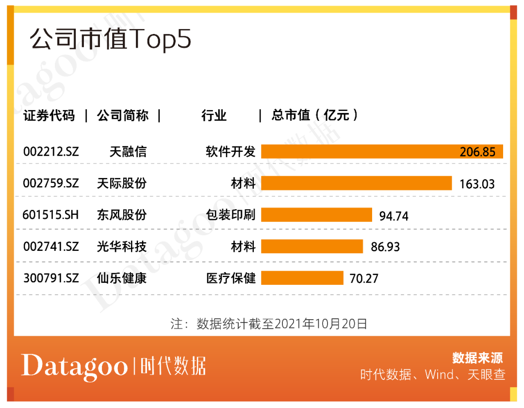 在資本市場的推動下,上市公司獲得了快速發展,市值也有所增長。**據時代數據統計,截至2021年10月20日,共有2家公司市值突破100億元。**天融信(002212)的市值高居第一,為206.85億元;其後是天際股份(002759),市值為163.03億元。
