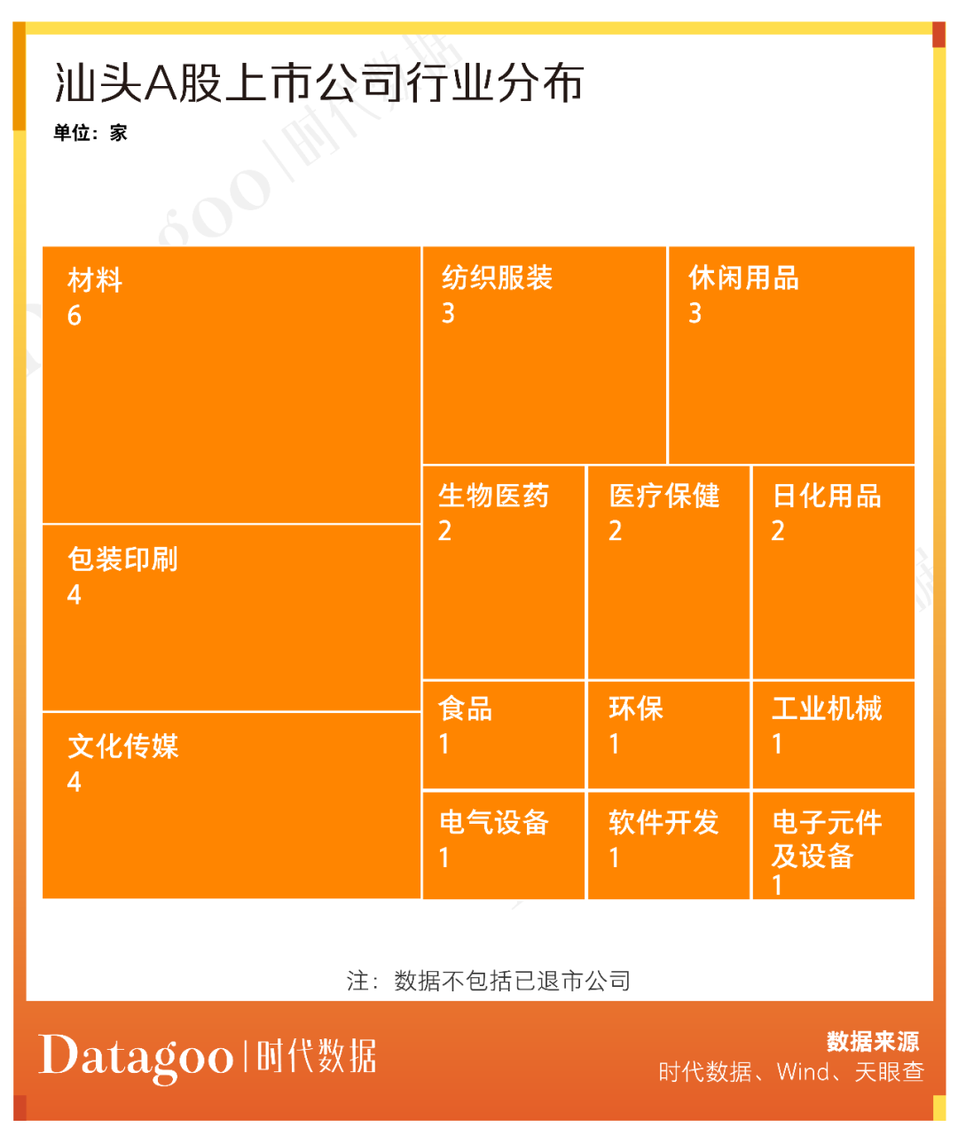 作為最早成立的四個經濟特區之一,汕頭大力發展民營經濟。現民營企業數已佔全市企業總數九成以上,成為推動汕頭經濟發展的主要力量。據時代數據統計,在上市的32家公司中,民營企業就有28家,佔比達到87.5%;此外,還有2家國有企業和2家外資企業。