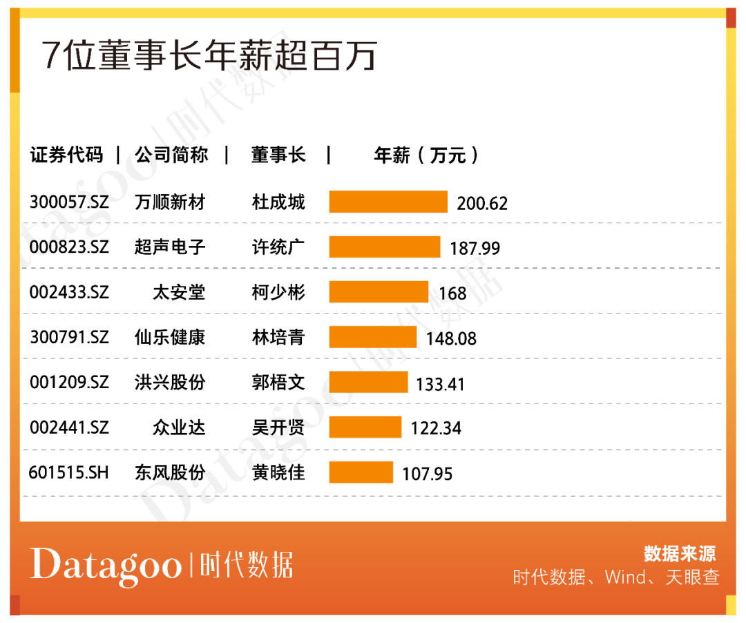據時代數據統計,在這32家公司中,有7家公司的董事長2020年年薪超過100萬元。其中,萬順新材(300057)董事長兼總經理杜成城年薪200.62萬元,位居第一;超聲電子(000823)董事長許統廣年薪187.99萬元,位居第二;太安堂(002433)董事長兼總經理、代董秘柯少彬年薪168萬元,位居第三。